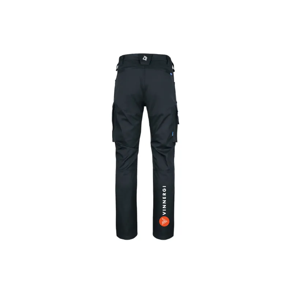 Servicebyxa i full stretch med modern, smal passform vilket gör att byxan upplevs rörlig trots slimmad passform. Benfickor med övervidd och dragkedja på båda sidor, även telefonficka på båda sidor. Tumstocksficka på höger sida. Infällda bakfickor. Bredare bälteshälla baktill för att undvika tryck från bälte vid ryggslut. Förböjda knän. Knäskyddsfickor som går att reglera i två höjder, öppning inifrån. D-ring fram. Dolda fästen för hängfickor i linningen (ref. art 9042). Dold midjeknapp.